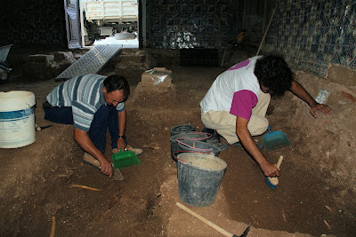 Remoção do reboco da parede do fundo da arrecadação, para posterior abertura de entrada de acesso à sacristia, a partir do actual local da Pia Baptismal: